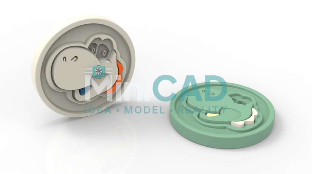 The coin body was modeled as a two-layer assembly in SolidWorks — a base disc 40mm × 2.5mm in the primary color, and a face disc 40mm × 1.5mm in the accent color, joined at a Z-height corresponding to the NFC tag insertion point. The NFC tag cavity was cut into the top face of the base disc at 28mm × 28mm × 0.85mm — tight enough to retain the tag by friction without adhesive, allowing repositioning if needed. A chamfered edge at 0.5mm × 45 degrees was applied around the top face perimeter for clean aesthetics and safe handling. This is solidworks modeling service precision applied to a sub-5mm stack height product.