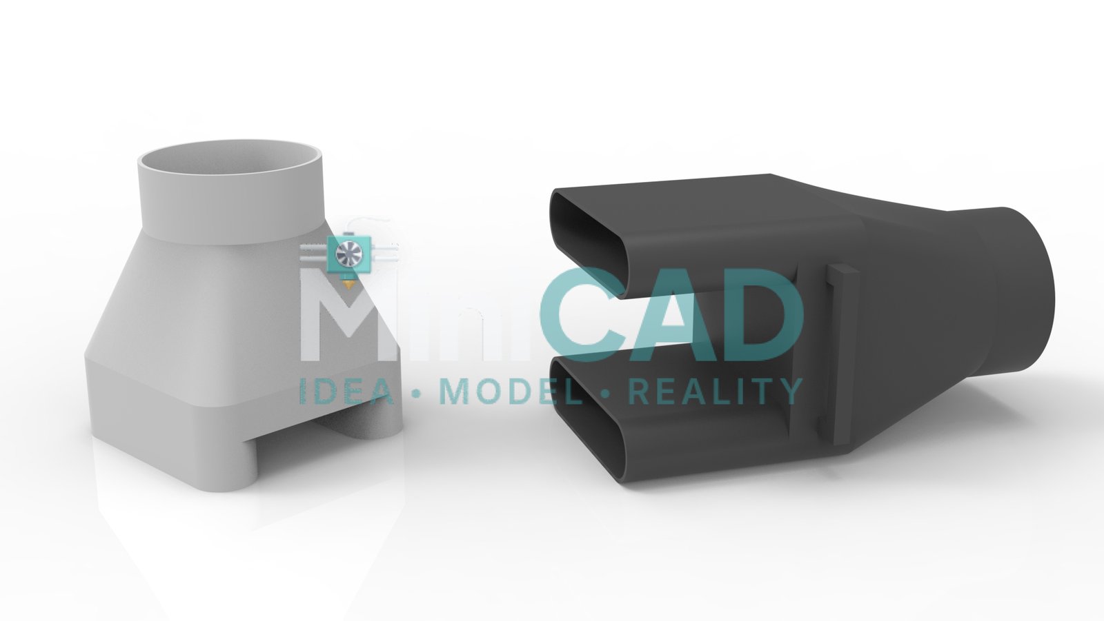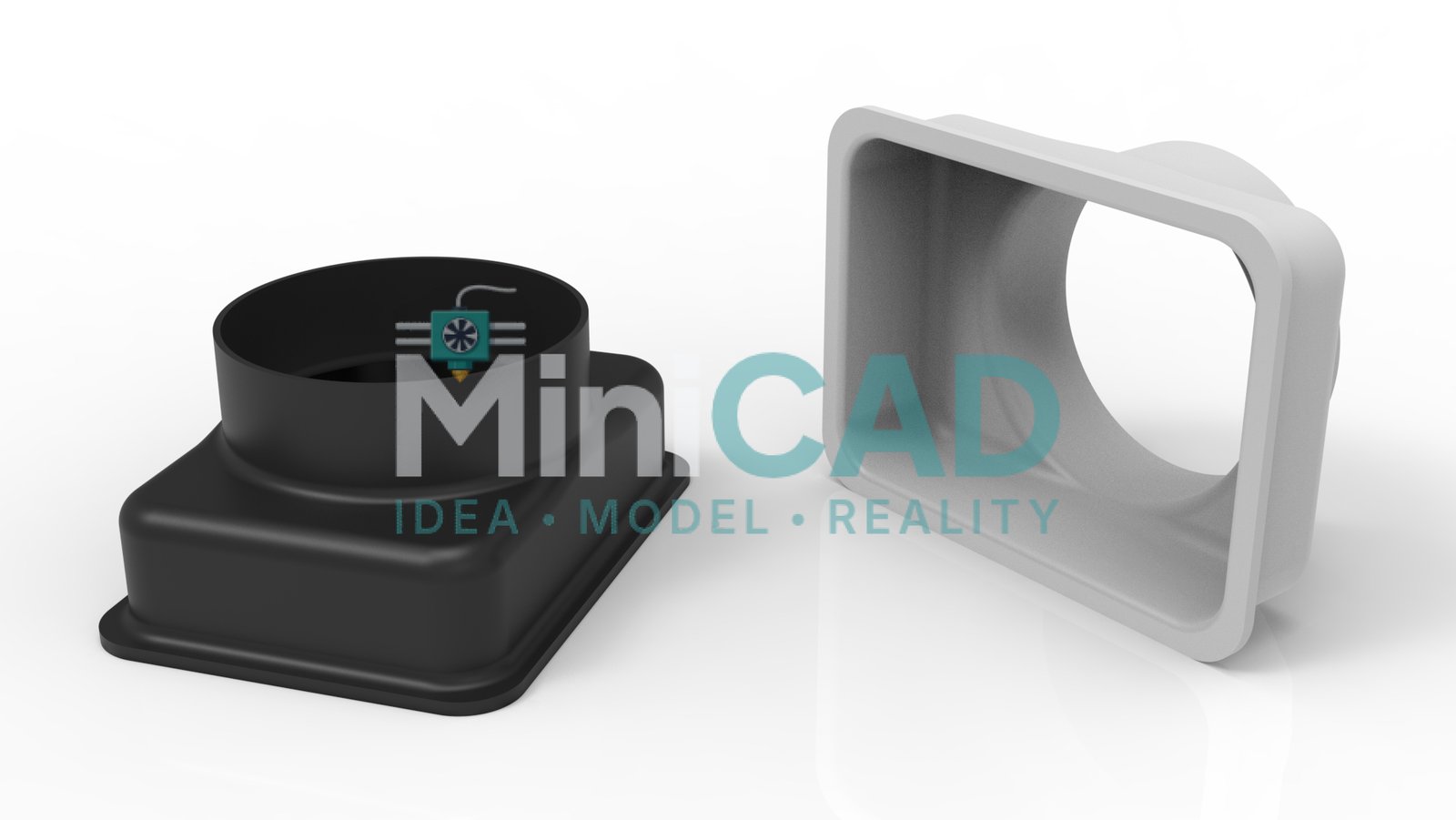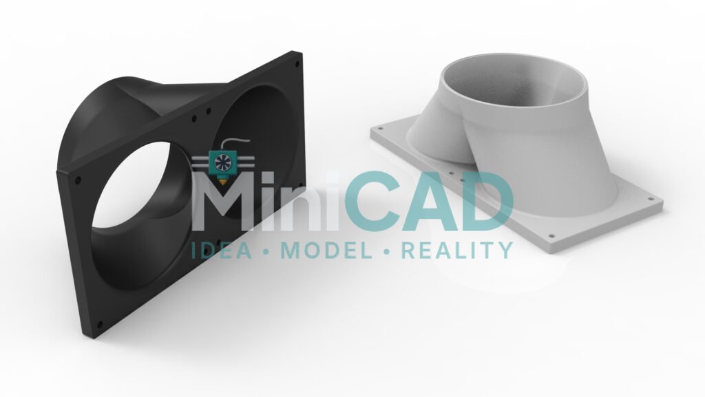 Both parts were modeled using SolidWorks lofted and swept features to generate smooth internal transitions — critical for maintaining laminar flow and minimizing pressure drop. The diffuser transition profile was designed as a guided loft between the circular and rectangular profiles with three intermediate guide curves to control wall angle at each cross-section. Our stl file design service export workflow validated wall thickness along the loft path before the final STL was generated, ensuring no wall dropped below 1.8mm at any point.
